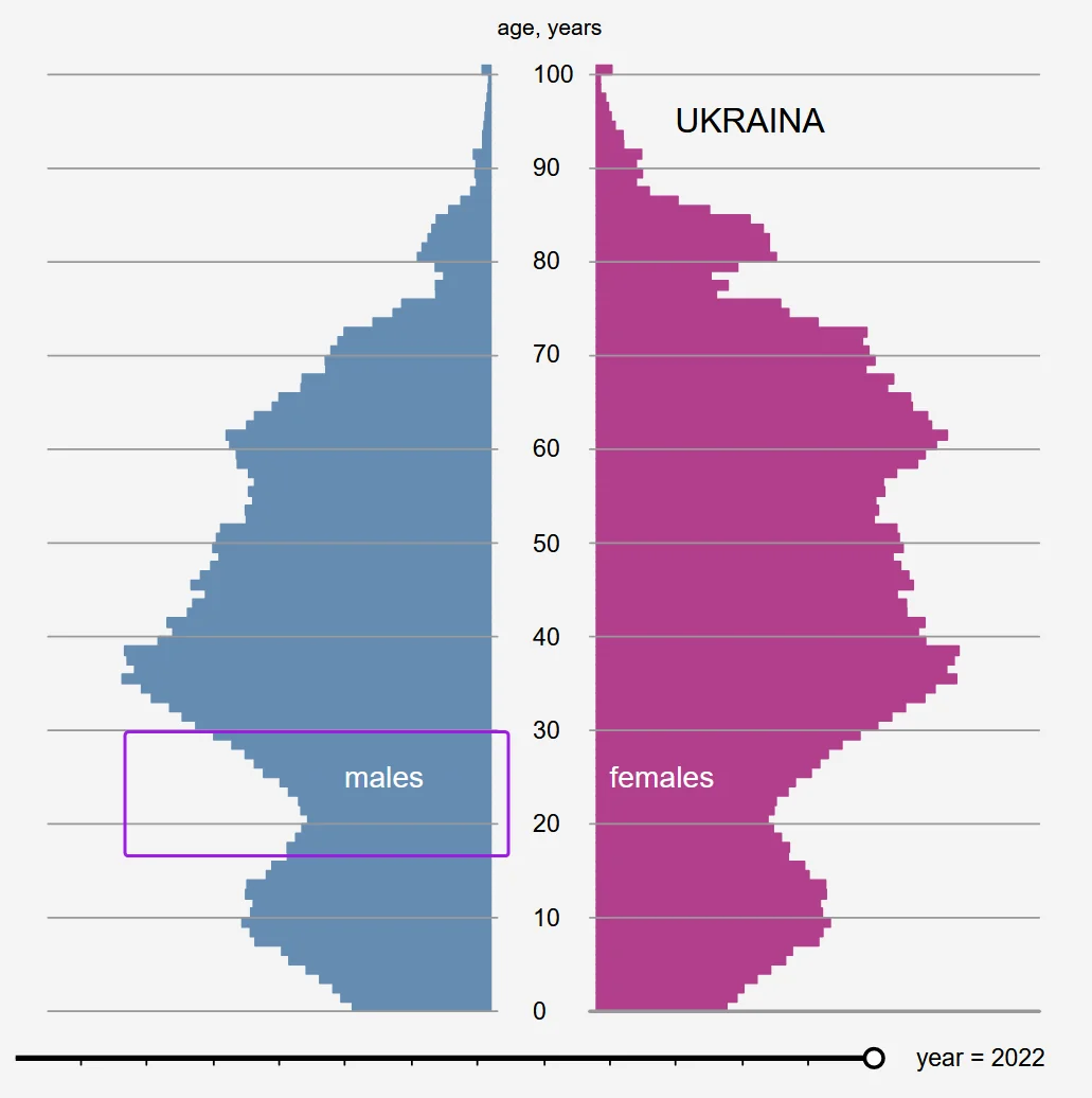 Зеленський вже майже рік не підписує закон про призов з 25 років. І схоже, що в новому законопроєкті ця норма теж не пройде. І діло мабуть в тому, що в Україні дуже мало чоловіків цього віку, демографічна яма: